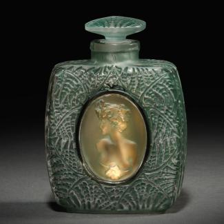 Highlighting the sale was a 1912 Rene Lalique Fougeres perfume bottle selling for $33,600 leaving its $6,000 high estimate far behind. Lalique’s first complete perfume presentation, the 1909 Cyclamen for Coty, doubled its high estimate at $20,400. Rounding out the top three lots was a rare c1918 D’Orsay Bonjour yellow glass fish-form bottle in silk box, selling to an excited phone bidder at $30,000.